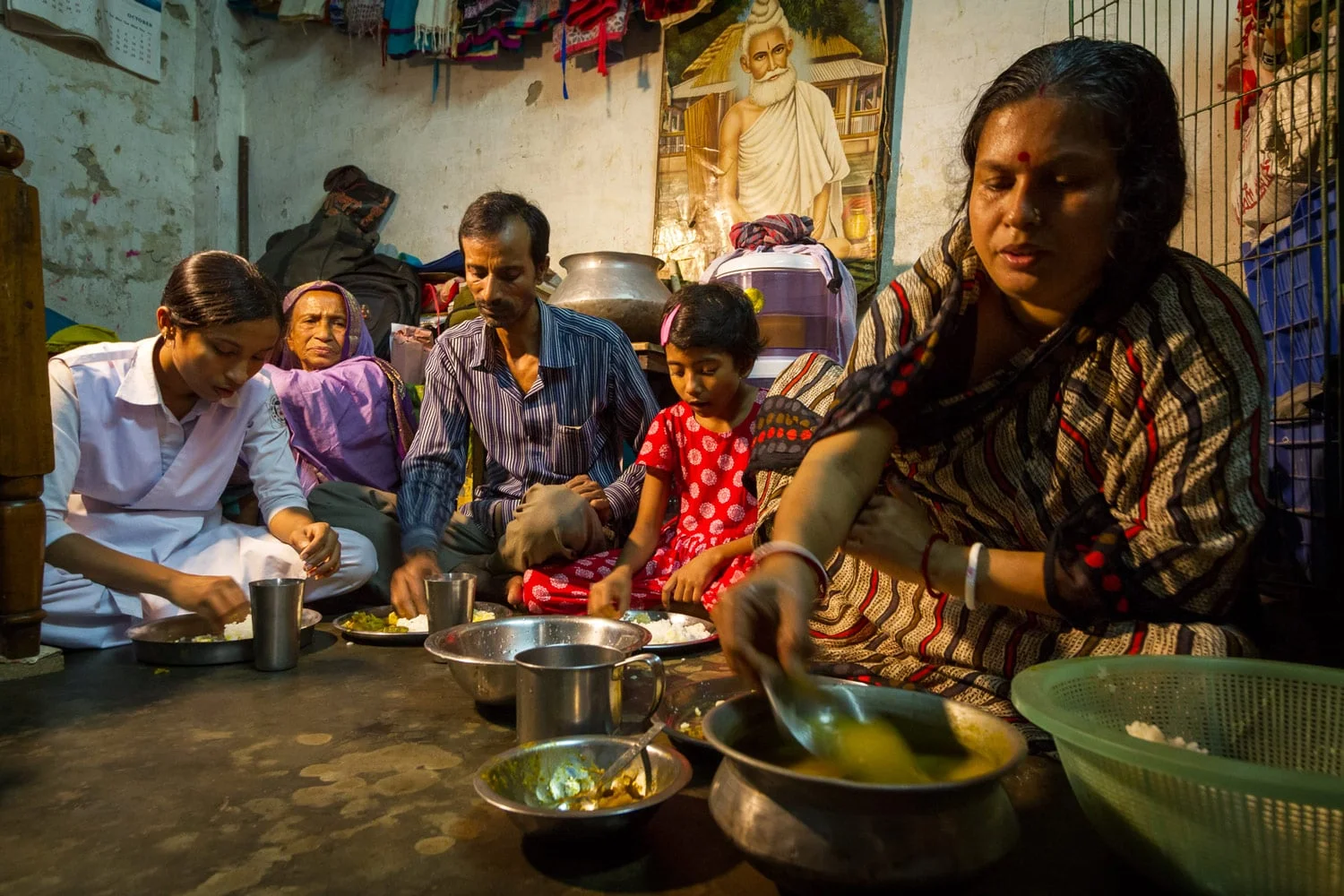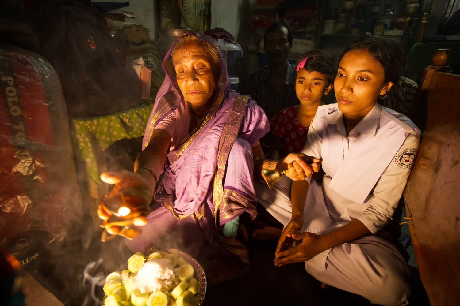 Shushmita’s school day is over by 10:30 am and she is home before 11. There isn’t much to do in the single room she shares with her parents, her grandmother and her older brother and sister. And in crowded Dhaka, there few places to play outside that are safe for a young girl. After she has a bath, Shushmita does the mid-day puja with her family, has lunch and then has a sleep. Afterwards, it is time to get back to her studies. With so little time in class, tutoring is a fact of life for most students in Bangladesh. But it costs money, and business is slow at Shushmita’s father’s barbershop these days. Fortunately, Shushmita’s older sister can help. They work together for a while before she leaves for work. When they finish, there is still time to watch some TV and play a game with a friend before eating dinner and getting her school things ready for the morning.